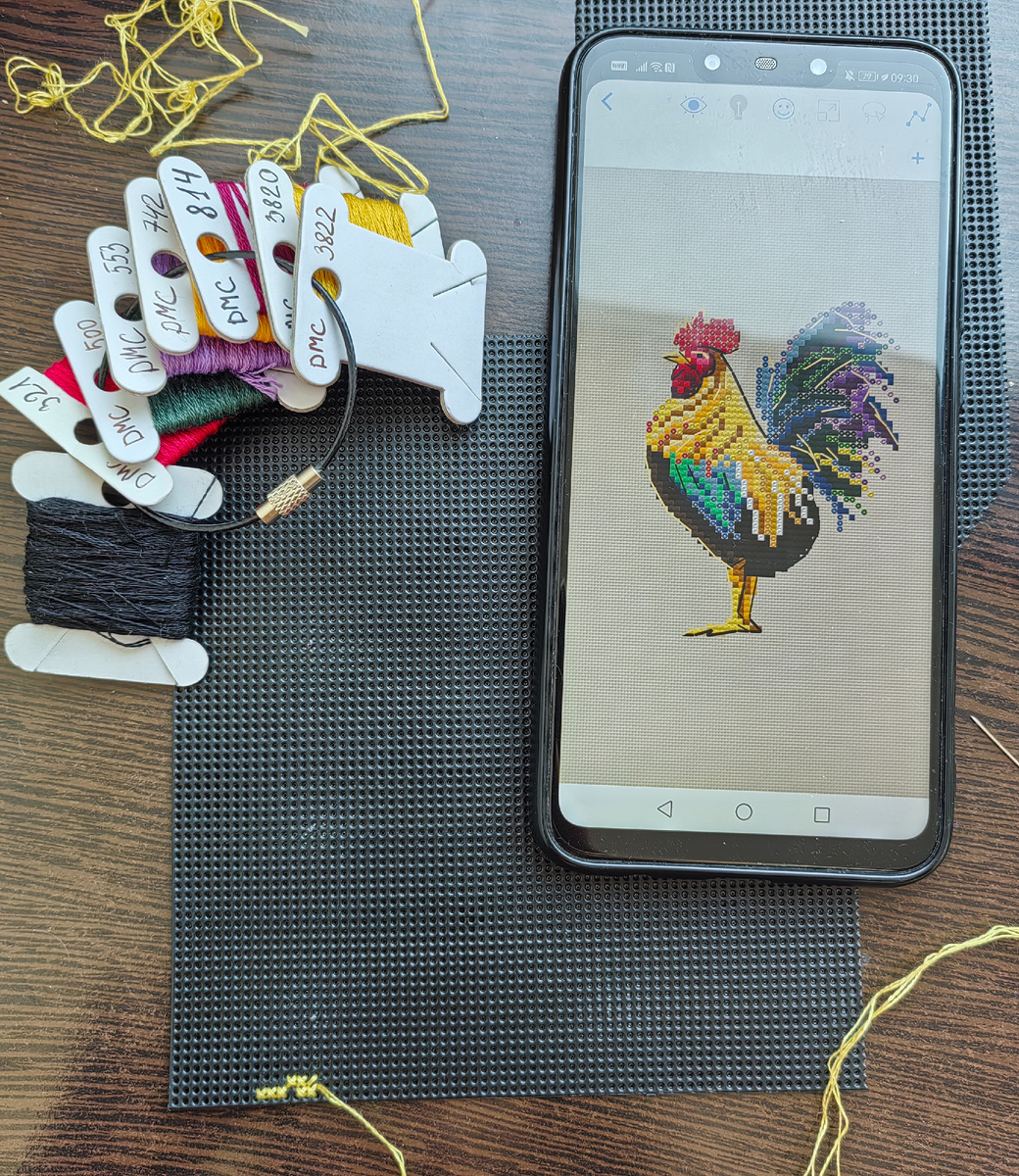 По ключу из палитры ДМС нашлось только половина оттенков, остальное я подобрала из остатков ниточек, ориентируясь на референс.