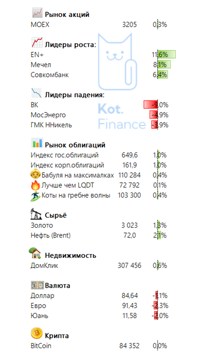 Чистая энергия EN+ снова нужна миру. Всё растет, доллар падает. Новые размещение облигаций. А также свежие дефолты 🔥 🤝Присоединяйся к сообществу Кот.Финанс -- Новые размещения •МТС (ААА) фикс 18,75% на 15 мес. Интерес: ★☆☆☆☆ •Металлоинвест (ААА) флоатер КС+1,9% на 2 года Интерес: ★★★☆☆ •Делопортс (АА-) фикс 20,75% на 1,5года. Интерес: ★☆☆☆☆ •СЭТЛ (А) фикс 24,5% на 1,5года (оферта). Интерес: ★★☆☆☆ •ЯТЭК (А) фикс 24% на 2года. Интерес: ★★☆☆☆ •ЯТЭК (А) флоатер КС+5% на 2года. Интерес: ★★☆☆☆ •Девар Петро (ВВ+) фикс 29,5% на 3 года🔔Call через 2 Интерес: ★☆☆☆☆ •Технология (ВВ+) фикс 28% на 3 года Интерес: ★☆☆☆☆ •Агродом (В) фикс 30% на 1год (оферта) Интерес: ★☆☆☆☆ •Агродом (ВВ) фикс 28,5% на 3года Интерес: ★☆☆☆☆ Интересные события •Инфляция в годовом выражении 10,08% (пред.значение 10,11%). Огурцы побеждены •Апелляция поддержала решение снять с Домодедово запрет на выплату купонов •Частные инвесторы не могут получить купоны по облигациям Борец. Проф.участники могут ❗️Оферта в ВЭБ РФ-18.