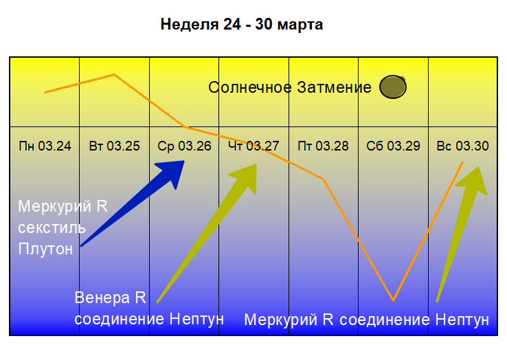 ГОРОСКОП ЗДОРОВЬЯ на НЕДЕЛЮ 24 – 30 МАРТА Внимание В прогнозе даются советы и рекомендации связанные только с консервативным лечением. Не с хирургией и тому подобными активными вмешательствами в дела организма. На это и следует ориентироваться в борьбе за здоровье. С 22 марта Луна способствует избавлению от вредных привычек, борьбе с хроническими заболеваниями, мониторингу скрытых до поры до времени недугов. Это очень важно, потому что 29 числа грядёт Солнечное затмение и к нему подойти необходимо с чистым телом и разумом. Будьте очень внимательны к Новолунию 29 марта, ибо именно в этот день произойдёт Солнечное затмение, которое открывает период связанный со здоровьем до следующего Солнечного затмения. Поэтому будьте тщательны, не перегружайтесь физически и психически, перед затмением избавляйтесь от вредных привычек и хронических заболеваний. После очень скрупулёзно вырабатывайте план оздоровления… Большую часть 24 марта Луна в Козероге. Активно начинайте бороться с хроническими забо