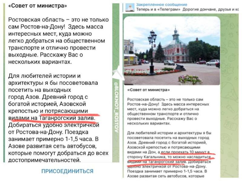 К сожалению, в туристической рекомендации от министра была допущена ошибка: упоминание Таганрогского залива в контексте Азова оказалось некорректным. От Азова до Таганрогского залива — 12 километров по прямой, и видов на залив из Азова не наблюдается. И «потрясающих видов» здесь не будет, как сперва написала Алена Беликова. Добавим, что город омывают только две реки Дон и Азовка, на всякий случай. Было-стало. С кем не бывает. Скриншоты telegram-канала Алены Беликовой Впоследствии глава министерства транспорта внесла изменения в текст. В результате он приобрел следующий вид: — Древний город с богатой историей, Азовской крепостью и потрясающими видами на Дон, а если проехать 10 минут в сторону Кагальника, то можно насладиться видами на Таганрогский залив, — говорится в сообщении. Однако для Алены Беликовой, уроженки Калининграда, подобная ошибка вполне допустима. Многие местные жители не заметили географической не точности. С другой стороны, модерацию комментариев никто не отменял. Ведь
