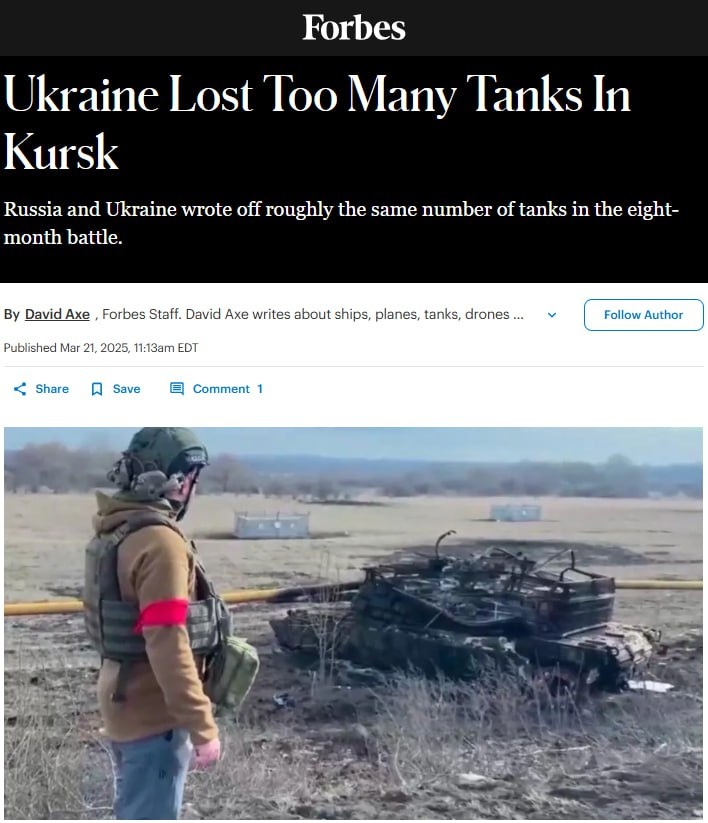 Forbes считает, что Украина потеряла слишком много танков в «Курской битве». Издание сообщает, что за время курской операции украинские войска потеряли 55 танков, в то время как армия РФ – 66. То есть соотношение 1,2 в пользу Украины. В то же время за все годы войны, начиная с 24 февраля 2022 года, по данным Forbes, соотношение составляет 1:3,4 в пользу Украины. «Это плохая новость для Украины, которой, согласно одному из недавних анализов, необходимо нанести России в три раза больше потерь, чем Россия наносит Украине, чтобы ослабить российские вооруженные силы быстрее, чем Россия ослабит украинские», – говорится в материале. Издание отмечает, что украинцы достигли этого критического показателя перед августовским прошлого года вторжением в Курскую область, но во время отступления ВСУ оттуда на прошлой неделе, русские уничтожили или захватили больше танков, чем украинцы могли позволить себе потерять. Украинские вооруженные силы вступили в конфликт в феврале 2022 года, имея на вооружени