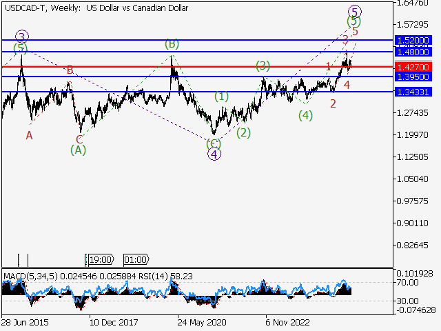 На недельном графике предположительно продолжается развитие восходящей пятой волны большей степени 5, в рамках которой формируется волна (5) of 5. На дневном графике сформирована третья волна меньшей степени 3 of (5) и завершилось развитие коррекции в виде четвертой волны 4 of (5). Начала развиваться пятая волна 5 of (5). На таймфрейме H4 предполагается, что волна i of 5 и локальная коррекционная волна ii of 5 завершены, а волна iii of 5 начала развиваться. Если предположение верно, то пара USD/CAD продолжит рост к отметкам 1.4800 – 1.5200. Уровень 1.4270 является критическим в данном сценарии, так как его прорыв позволит паре продолжить снижение к отметкам 1.3950 – 1.3433.