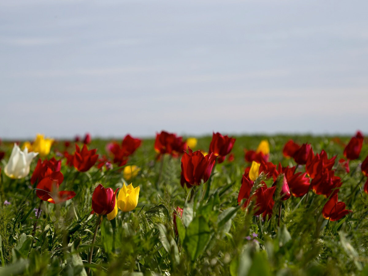 Апрель — лучший месяц, чтобы побывать в этом аскетичном краю, пока ещё недооценённом туристами. Именно в это время степь начинает прогреваться и в итоге вспыхивает яркими тюльпанами всех цветов и размеров. Цветут они всего 7–14 дней. В поддержку этих краснокнижных растений 10 лет назад был придуман Фестиваль тюльпанов.