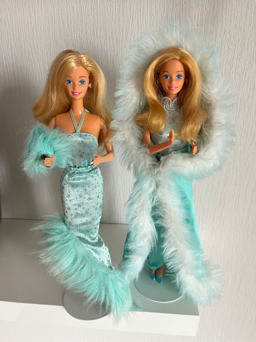 Почему-то с приложения в телефоне теперь не могу сразу ставить смайлики, только при редактировании 🤔 Мечтала, чтобы две Magic Moves стояли рядом на полочке, одна в родном наряде, а вторая в аутфите из фэшен пэка для Barbie Superstar 1988г. Думаю, ей очень идет 🩵 Так выглядит аутфит в коробочке. А так на куколке с одноименным выпуском Barbie Superstar (1988 г.) У меня не хватает еще 2х меховушек на резинке и коньков. Как обычно долго ждала набор в продаж, на ибей тоже были предложения за 4-9 ❗️😱тыс руб. Как только купила не полный комплект, сразу и на ибей появились дешевые варианты😒 О том как у меня оказалось две Magic Moves можно почитать здесь Обе куколки производства Малайзии, 1985 год выпуска. До сих пор не понимаю, как кому-то нравится часто переодевать кукол. Я минут 40 их обеих наряжала🥵. Вся одежда такая малюсенькая, а бедра у барбейек приличные, еще и за резиновые ноги все цепляется, не скользит, как по пластику, к тому же винтажные аутфиты сейчас трудно приобрести