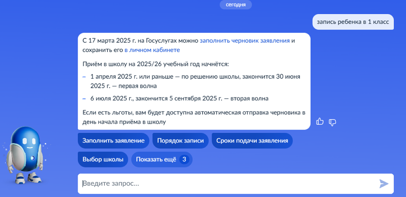 На сайте достаточно просто ввести «запись в первый класс», и помощник предложит вам несколько вкладок.
