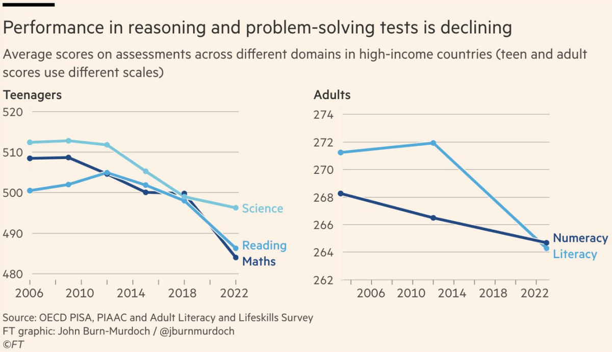 ТЕЛЕГРАМ КАНАЛ ПСИХОЛОГИИ - приглашаю Средние баллы на тестах в разных областях в странах с высоким уровнем дохода (подростки и взрослые оцениваются по разным шкалам) Science (Наука) – светло-голубая линия Reading (Чтение) – средне-синяя линия Maths (Математика) – тёмно-синяя линия Numeracy (Математическая грамотность) – светло-голубая линия Literacy (Грамотность/чтение) – тёмно-синяя линия Источник: OECD PISA, PIAAC и Adult Literacy and Lifeskills Survey Графика: Financial Times (John Burn-Murdoch) Общая тенденция – наблюдается устойчивое снижение среднего уровня навыков как у подростков, так и у взрослых в странах с высоким уровнем дохода за последние 15+ лет. В 2006 году средние баллы по всем дисциплинам (наука, чтение и математика) были стабильны, около 510 баллов. После 2012 года начинается спад по всем направлениям, и к 2022 году средние баллы опускаются ниже 500, а по математике — даже ближе к 480. Особенно заметно снижение в области математики и чтения. Аналогично подросткам,
