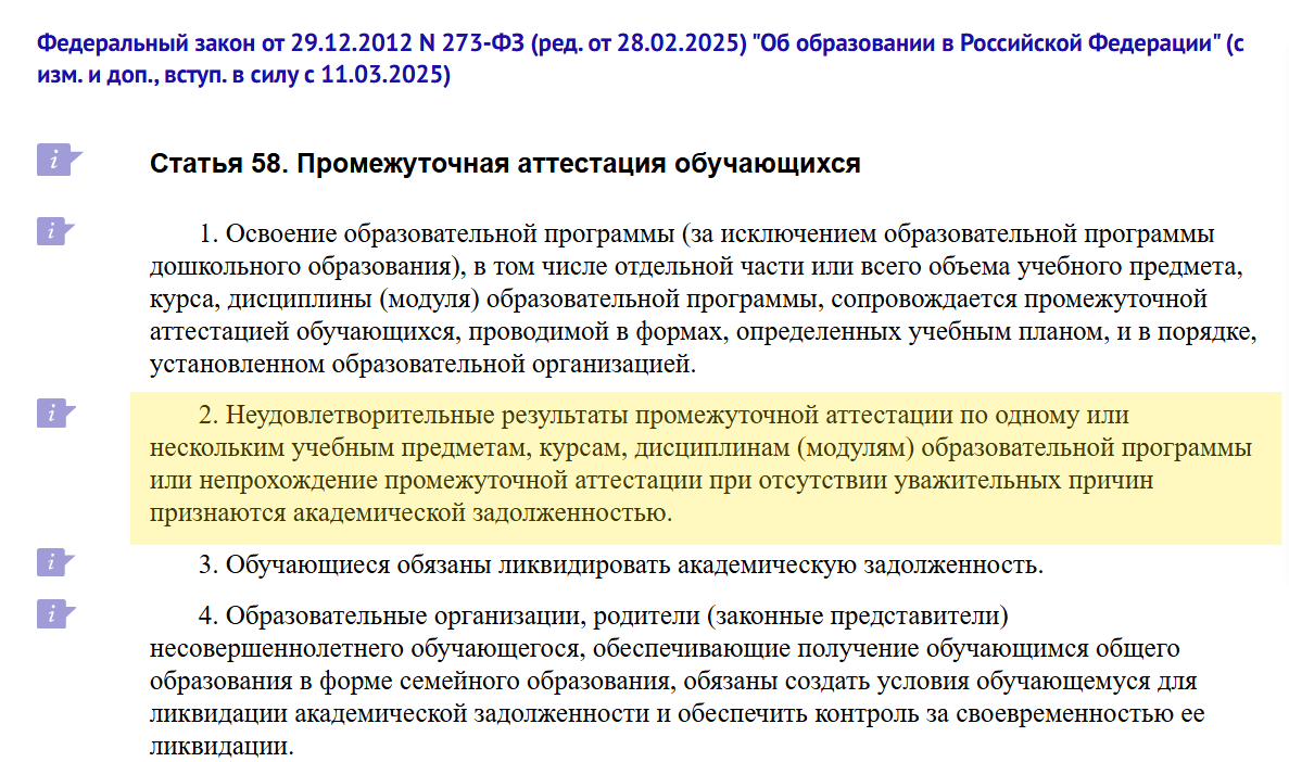 Регулируется вопрос академической задолженности статьёй 58 ФЗ "Об образовании в РФ" от 29.12.2012 г. № 273-ФЗ (далее Закон об образовании). И это любимая статья органов местного самоуправления по всем регионам)) Разберёмся в формате вопрос-ответ. 1. Когда возникает академическая задолженность (АЗ)? Согласно ч. 2 ст. 58 Закона об образовании АЗ возникает: 2. Если ребёнок на СО нигде не зачислен, не сдаёт ПА, на него распространяется действие 58 статьи Закона об образовании? Нет. Так как для того, чтобы возникла АЗ, необходимо: 3. Имеет ли право ребёнок, получающий образование на СО, быть не зачисленным в ОООД? Да, конечно. Образование на СО ребёнок получает вне ОООД (статьи 17 и ст. 63 Закона об образовании), в ОООД же ребёнок зачисляется только для прохождения ПА и/или ГИА экстерном (п. 9 ч. 1 ст. 33 и ч. 3 ст. 34 Закона об образовании). 4. А что значит "зачислен", кто является инициатором зачисления? Согласно п. 31 Приказа Минпросвещения РФ от 02.09.2020 г. № 458 и ст. 53 Закона об об
