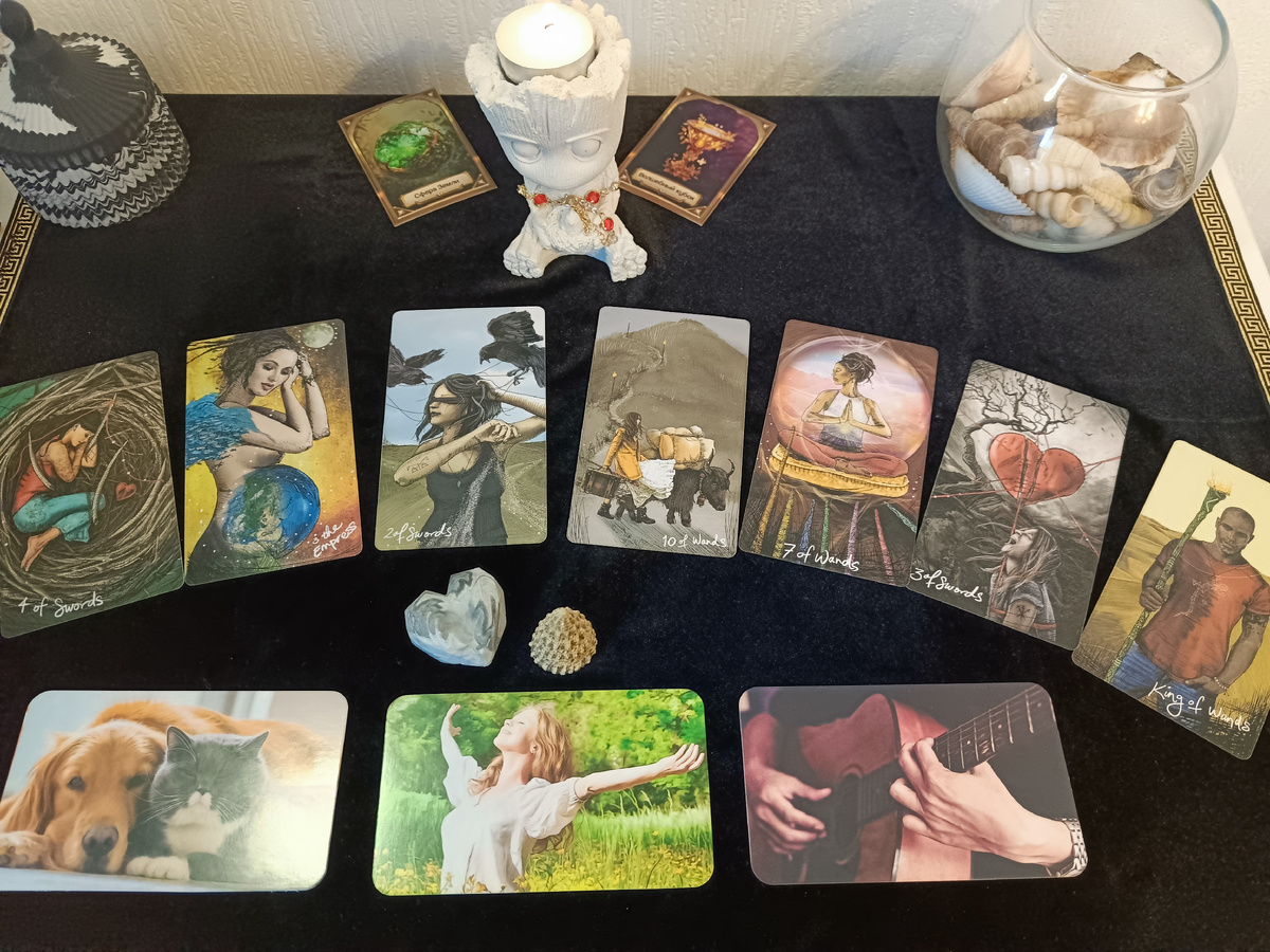 Всем привет 👋.Заглянем немножко вперёд 🔥. Где этот "принц" или "принцесса " ?🤔 Посмотрим 👀.. После долгого затишья и наслаждения своей компанией в одиночку , наступает период , где вы обретаете опору и самоценность, когда самому от себя хорошо 🌝. Ничего не планируя, можно сказать с "закрытыми глазами", вы начинаете для себя движение. 10 жезлов - это когда иду хоть и тяжело , но иду. Ощущение восторга от самого себя. Комфортное утро,обед,ужин.🌞 Мне так хорошо и свободно.Но сердце болит, остаётся грусть от прошлых событий. Король Жезлов стоит.Карта - показывающая страстного и уверенного в себе человека.С ним и предстоит знакомство . Очень стремительные и интересные люди. Люди огня 🔥. Активирует ваше сердце это человек. Они любят путешествовать и общение, рутина и скучная жизнь не про них. Если посмотреть на карты, видно солнечную погоду, возможно это будет летний период , самое время для взаимодействия и знакомства .💫 Животных видим.👀 Как-то это знакомство будет связанно с ним