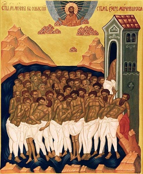В городе Печоры Псковской области стоит всем известная каменная церковь, посвящённая памяти мучеников Севастийских, числом сорок. В середине 16 века она, будучи деревянной, была перенесена игуменом монастыря Корнилием за ограду на приезжий монастырский двор для того, чтобы удовлетворять духовные нужды людей, которые образовывали тогдашние слободы вокруг обители. Ежегодно 22 марта эта церковь отмечает свой престольный праздник, вспоминая событие, совершившееся около 320 года в армянском городе Севастии. История возвращает нас к эпохе правления византийского императора Константина Великого. Империя тогда была разделена. Одной частью правил Константин, другой - Ликиний. В первой в 313 году был издан Миланский эдикт, объявляющий свободу вероисповедания, и христианство стало дозволенной религией, во второй оно, по прежнему, оставалось гонимо, как в первые три века. Ликиний, будучи язычником и видя быстрое распространение христианства, готовил поход против Константина и боялся, что в рядах