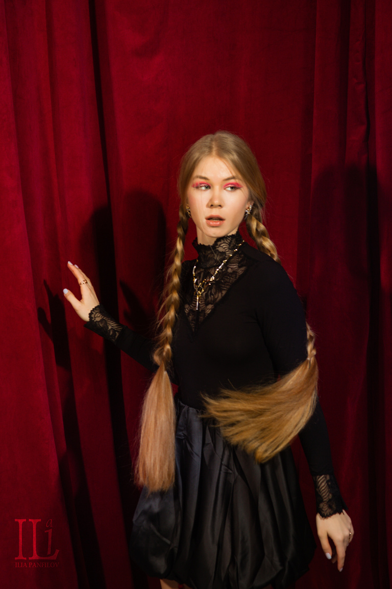 Красный занавес в одной из фотостудий натолкнул меня на идею добавить в образ красные тени на глазах модели – словно отражение огней сцены в её взгляде. Уже во время съёмки решили добавить цилиндр, который придал образу ту самую загадочную страсть и шарм парижского кабаре, где каждая деталь — не просто аксессуар, а элемент истории. Свет, тени, позы — всё работало на ощущение кинематографичности, как будто снимаем кадры из старого фильма. Обожаю, когда такие идеи рождаются на лету и прямо на съёмке оживают!