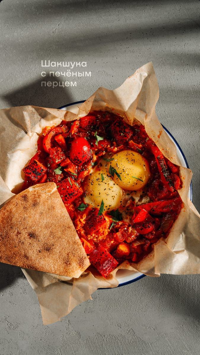 История блюда Шакшука (от арабского «смесь») зародилась в Северной Африке, но стала символом израильской кухни. Традиционно это яйца, томлёные в томатно-овощном соусе с паприкой и зирой. В нашем рецепте шакшука встречает греческий сыр сиртаки (аналог феты), хрустящий багет и неожиданный ингредиент — кока-колу, которая добавляет соусу карамельные ноты. Кинза придаёт свежести, а сиртаки — солоноватый акцент. Ингредиенты (на 2 порции) Овощи и зелень: - Лук репчатый — 1 шт. (100 г) - Чеснок — 2 зубчика (10 г) - Красный болгарский перец — 1 шт. (150 г) - Помидоры свежие — 2 шт. (200 г) или томатная паста — 2 ст. л. - Кинза свежая — ½ пучка (20 г) - Основа: - Яйца — 4 шт. - Кока-кола — 100 мл - Сыр сиртаки (или фета) — 80 г Гарнир: - Багет — ½ шт. (нарезать ломтиками) Специи и масло: - Оливковое масло — 2 ст. л. - Тмин (зира) — 1 ч. л. - Паприка копчёная — 1 ч. л. - Соль, перец — по вкусу Процесс приготовления 1. Подготовка овощей: - Лук и перец (предвари