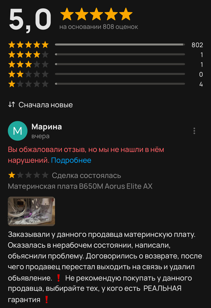 Давно и очень долго продаю на Авито - под тысячу успешных сделок. Минимум отрицательных отзывов. Но когда за дело берутся конкуренты, получаем вот такое: Вы скажете, что я мошенник, обманул клиента, но суть в том, что СДЕЛКИ НЕ БЫЛО! Просто написало какое-то чудо с абсолютно левого аккаунта, попросило заказать Авито-доставкой, а позже оставило отзыв через час после «сделки» и исчезло в закат! Ладно, думаю, Авита такие отзывы удалит на раз-два. Очевидна накрутка: разные города с покупателем, скринов оплаты не было, в мессенджеры не переходил, заказов с Авито доставкой тоже не было, отзыв оставлен спустя час после переписки. Но нет - «МЫ НЕ НАШЛИ В ОТЗЫВЕ НАРУШЕНИЙ»))) Я вообще не понимаю, как может быть Авито настолько плох при тех сверхприбылях, что он получает. Сколько еще терпеть подобный маразм? Когда вы начнете реально решать проблемы, когда выделите денег на нормальную, живую поддержку? Да она даже на аликэспрессе лучше, чем у вас. Молчу об ибее, грейледе и прочих иностранных анал