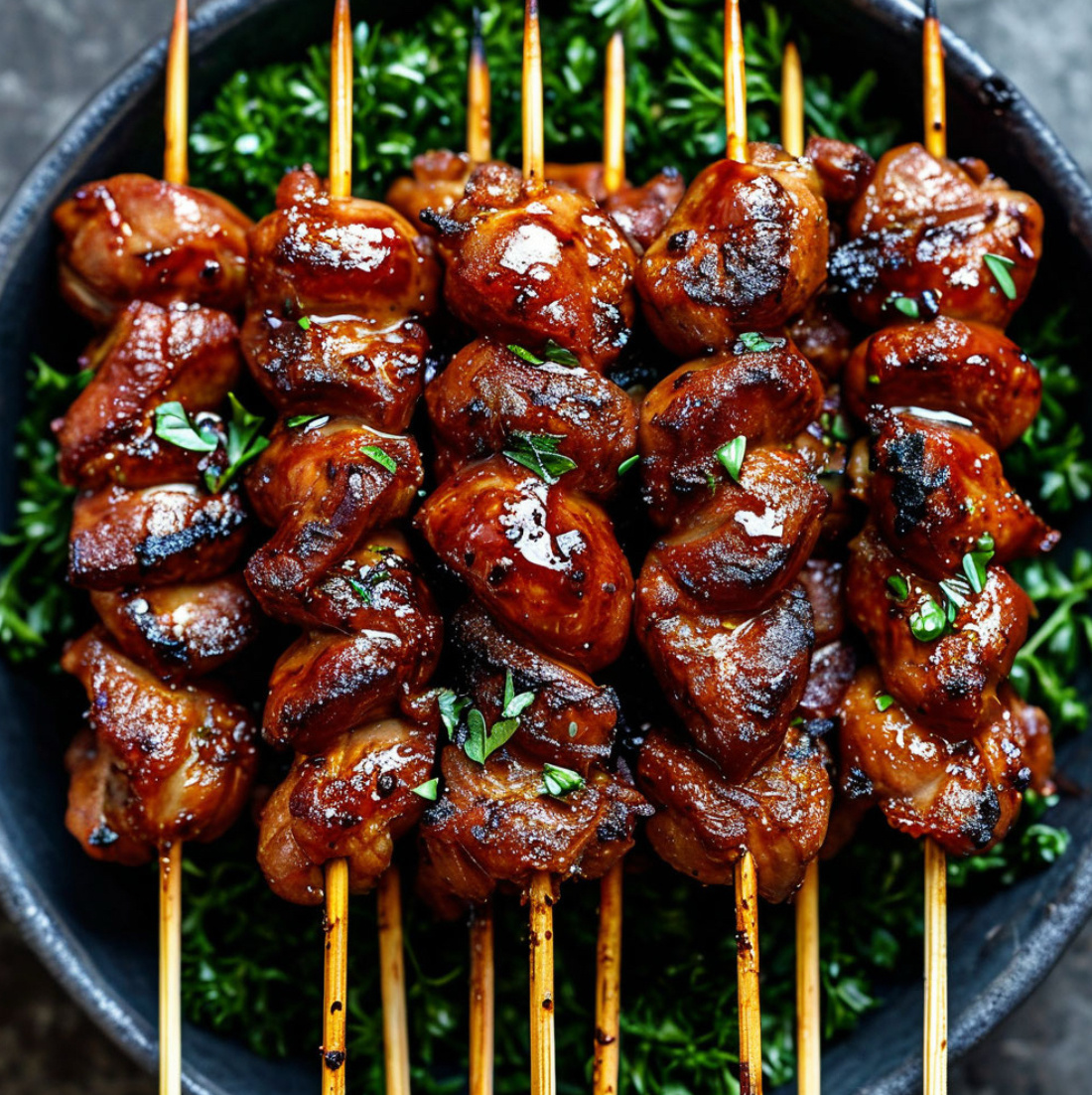 - Выложите готовые шпажки на тарелку, посыпьте кунжутом по желанию. Подавайте горячими с любым гарниром.
