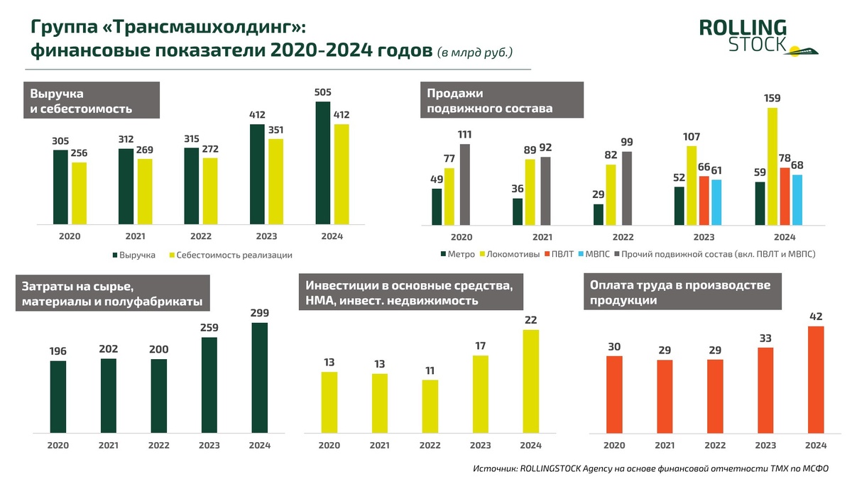Россия: Согласно консолидированной отчетности группы «Трансмашхолдинг» (ТМХ), в прошлом году она получила выручку от реализации продукции в 504,7 млрд руб. – это на 22,6% больше, чем в 2023 году. Себестоимость реализации составила 412 млрд руб. (+17,4%), чистая прибыль – 28,1 млрд руб. (в 2,7 раза больше, чем в 2023). Основной объем в структуре выручки пришелся на реализацию локомотивов: от поставок тяги ТМХ получил 159 млрд руб. (почти в 1,5 раз выше результата-2023). Ранее Росстат по итогам 2024 года фиксировал значительный рост производства магистральных тепловозов (их выпускает Брянский машиностроительный завод), а объем выпуска на Новочеркасском электровозостроительном заводе сохранился примерно на уровне 2023 года. Поставки поездов метро принесли холдингу 59 млрд руб. (+13,2%). Основные контракты ТМХ по этому направлению – в Москве и Санкт-Петербурге. ТМХ впервые дал в отчетности детализацию по пассажирской технике: ранее она объединялась в прочий подвижной состав. Так, в 2024 го