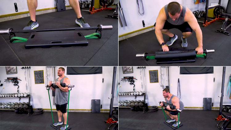 Привет! Сегодня займёмся ногами. Разберём 5 упражнений для ног с использованием фитнес-резинок и грифа. 1️⃣ Первое упражнение – приседания Зерхера или Зерчера. Это тяжёлые приседания с грифом – отличное упражнение для нижней части тела, где гриф удерживается на сгибе локтей. Крепим длинную среднюю резинку на карабины к грифу и продеваем её через платформу для ног. Ещё будем использовать валик из пенки, чтобы гриф не давил на руки. Берём гриф, становимся на платформу, отцентруем гриф, поднимаем его к бёдрам. Присядем, чтобы взять гриф на руки. Начинаем выполнять приседания Зерхера. Если вы новичок, возьмите резинку полегче. Можно немного облегчить это упражнение в плане удобства и добавить несколько блинов на гриф, при этом резинку взять слабее. Так гриф будет немного приподнят от пола, поэтому брать и опускать его будет немного легче. 2️⃣ Второе упражнение – классическая становая тяга. Удобно, что на гриф можно ставить блины. А можно прикрепить мощную резинку или несколько, что будет с