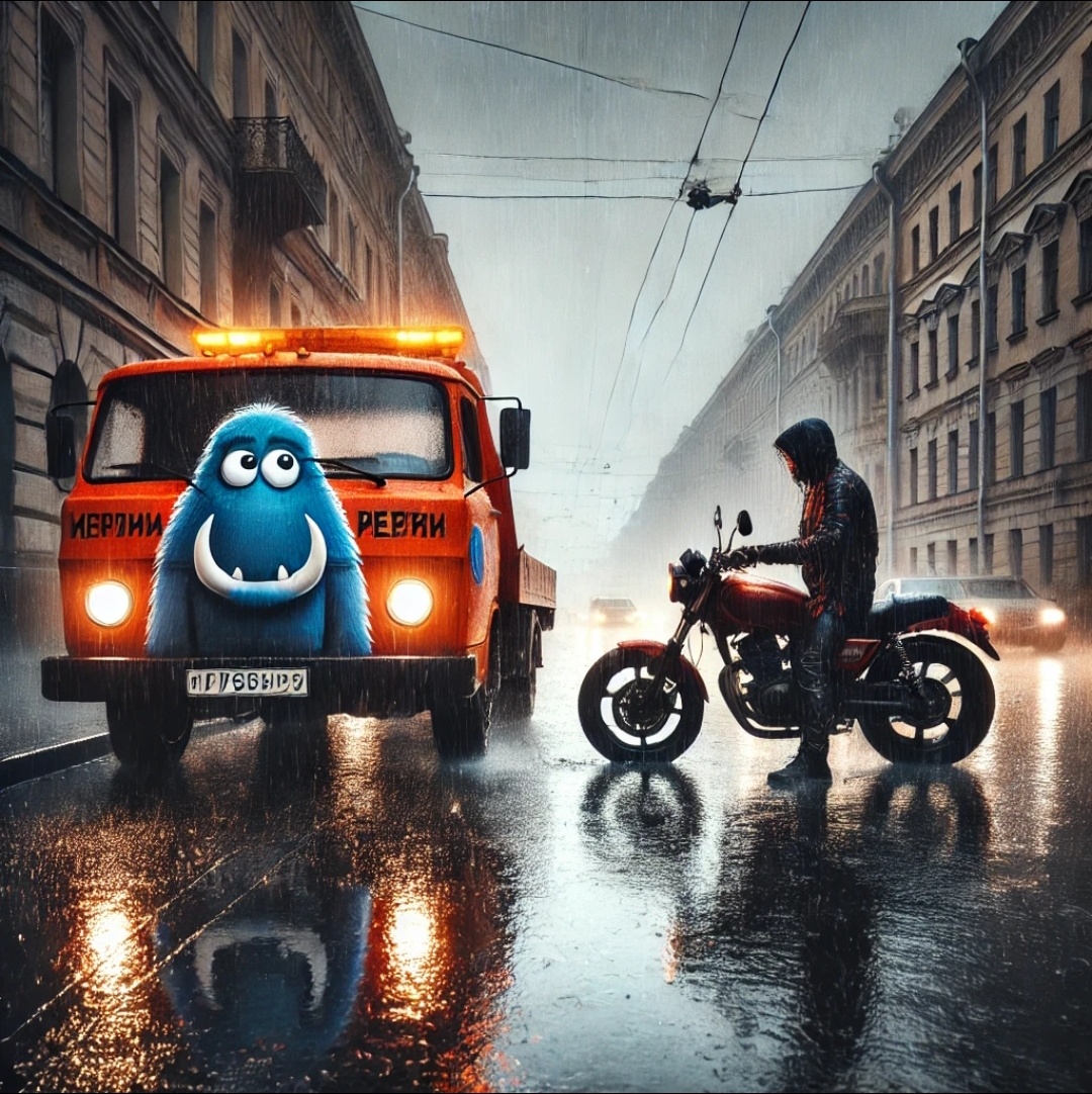 В мотомире имена не дают просто так. Их присваивают дороги, дожди, случайности и иногда — эвакуаторы с синими мамонтами. Мой ник — tРЕЗВЫЙ, где "t" — это Тоша, но история вовсе не о трезвости как состоянии души или печени. Хотя, возможно, и о ней тоже. Сейчас расскажу. Я возвращался с мото-фестиваля из Эстонии. Дождь лил как из ведра, асфальт глянцевый, мокрый, и я на своей Шадовке (Honda Shadow) неспешно катил по набережной Обводного канала. Вроде уже в городе, рядом дом, тепло на душе. Но не тут-то было. Из переулка, будто из ниоткуда, вылетает эвакуатор — рыжая кабина, мини-Камаз. Он буквально впрыгнул мне наперерез, как в кино. Я мгновенно — тормоз, перед, зад, ещё раз зад, сцепление, голова, сердце в пятки... Всё как в замедленной съемке Всё сработало, но у меня была та самая волшебная пол-секунды, чтобы принять решение — ушёл на встречку, по дуге вернулся на свою полосу. Спасибо городу — пусто. Остановился. Стою. Дышу. Жив. Не прилёг — уже радует! Тьфу-тьфу, не б