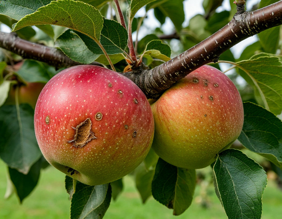 На яблоках болезнь оставляет безобразные метки: зеленовато-серые пятна с тёмной каймой. Под ними мякоть деревенеет, плоды искривляются, покрываются трещинами. Если заражение произошло перед сбором, мелкие коричневые язвочки проявятся уже в хранилище, превращая урожай в брак.