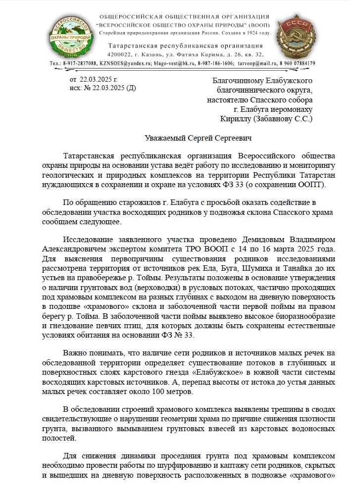 Карстовое гнездо (цирк) Елабужское. Письмо благочинному.
