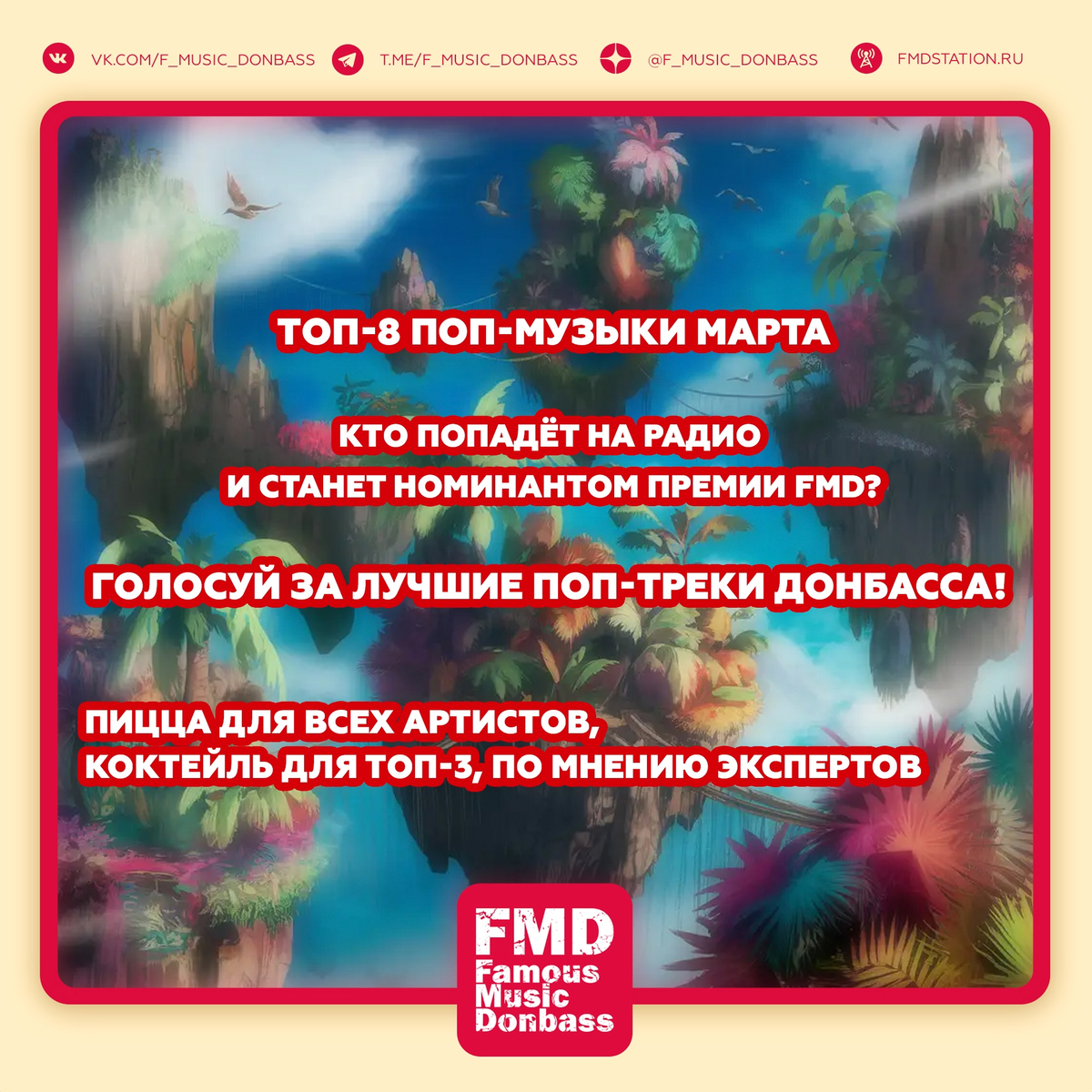 В этом месяце продюсеры Донбасса выпустили 32 сингла и 2 альбома. Отобрали традиционную восьмёрку самых интересных треков и приглашаем вас проголосовать за своих фаворитов. Пятидневное г о л о с о в а н и е среди наших подписчиков за лучший трек проходит здесь 👇 ❗ vk.com/topic-27690252_53874563 Результаты голосования будут учтены в «Главном чарте Донбасса»: победителям начислим от 1 до 8 баллов. В конце года главные музыканты по итогам чартов и голосований попадут в номинации ПРЕМИИ FMD 2025. Авторы трёх топовых треков по выбору экспертов станут кандидатами для участия в программе «Громче Пушек» на радио «Комсомольская Правда Новороссия». Слушаем чарт поп-музыки марта: ⭐ РАД, Skolio — HOOLIGAN (выбор подписчиков)