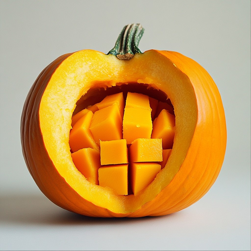 - Тыкву чистим и режем кубиками, как будто собираемся играть в оранжевое лего.
