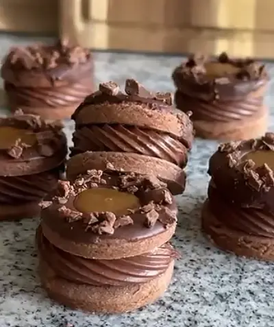 Если бы мне пришлось приготовить еще одно печенье на праздничный стол, то это определенно было бы это! Густой шоколадный крем с карамельной начинкой и шоколадным тестом. Восхитительно! Обязательно попробуйте его приготовить. Вот рецепт шоколадного печенья. Продукты необходимые для его приготовления: Для шоколадного крема: 300 г горького шоколада 200 г сливок Для теста: 280 г пшеничной муки 200 г размягченного сливочного масла 100 г сахарного песка один пакетик ванильного сахара одно яйцо 30 г какао-порока. Для карамели: 120 г сахара две столовых ложки воды 200 г сливок. Дополнительно: 150 г горького шоколада 50 г слегка нарезанного горького шоколада для посыпки. Продукты по списку мы собрали. Теперь сам пошаговый рецепт шоколадного печенья с карамелью. 1. Для приготовления шоколадного крема мелко нарежьте горький шоколад. Доведите сливки до кипения и залейте горячим шоколад. Продолжайте помешивать, пока все не растает. Затем дайте остыть и поставьте в холодильник минимум на четыре-пять