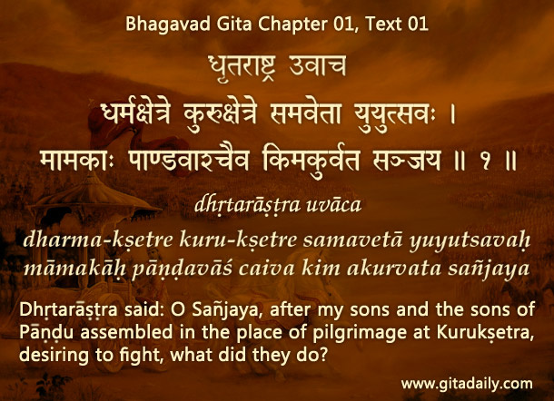 Это первый стих Гиты, и на самом деле это единственный стих, произнесенный в Гите Дхритараштрой. Хотя это всего лишь один стих, он является основополагающим. Как семя производит полноценного ребенка, так и основополагающий вопрос приводит к обширному обсуждению позже.