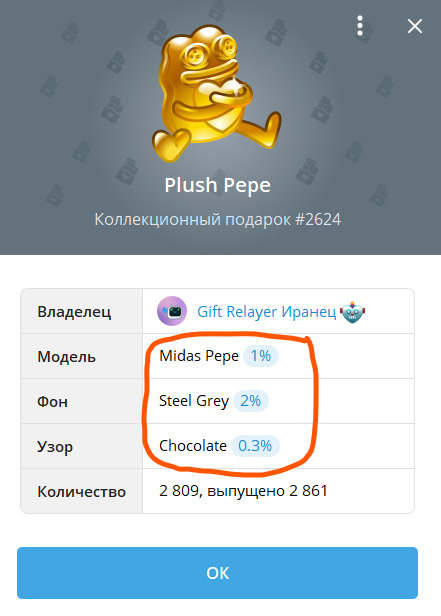😏 Редкость характеристик измеряется в процентах.Чем реже встречается характеристика, тем ценнее подарок. При этом модели, фоны и узоры в каждой коллекции отличаются.