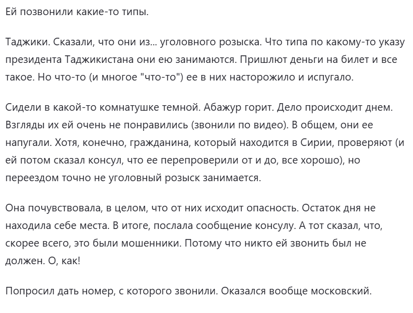 Началось то, что началось. На их поселок постоянно на падали. То бабах, то сверху прилетало. Про нее даже было снято несколько сюжетов на российских каналах, приезжали журналюги. Видео и ссылки будут внизу под этом текстом, читайте и смотрите после того, как текст дочитаете, а то Дзен посчитает, что вы не дочитали и не даст мне мои 50 р в день. Таджикский паспорт закончился, по сирийскому почти никуда нельзя въехать. В том числе, в те страны, где можно в теории в консульстве получить новый паспорт Таджикистана. С таджикским же паспортом, к примеру, можно в Ливан нормально легально въехать. С сирийским нет. Она приезжала с Ливан с дочкой (нелегально), какое-то время тут была. Потом ей приспичило поехать и развестись. В итоге, она там и застряла. Мы говорили, мол, давай приезжай. В итоге, дотянула до декабрьского переворота. Мы опять говорили, давай сюда в Ливан. А она начала договариваться с консульством в Кувейте, они в итоге прислали бумагу на возвращение. Паспорт только дома, мол, получать.