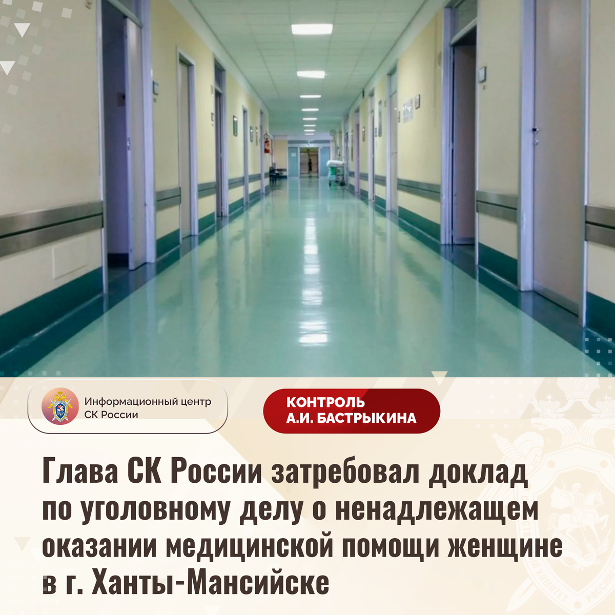 Глава СК России затребовал доклад по уголовному делу о ненадлежащем оказании медицинской помощи женщине в г. Ханты-Мансийске В СМИ и социальной сети сообщается о ненадлежащем оказании медицинской помощи 27-летней жительнице города Ханты-Мансийска. В декабре прошлого года женщина была госпитализирована для родоразрешения. В результате неверно выбранной тактики у пациентки возникли осложнения, ей потребовалось оперативное вмешательство с удалением органов. В СУ СК России по Ханты-Мансийскому автономному округу-Югре расследуется уголовное дело. Председатель Следственного комитета Российской Федерации Александр Иванович Бастрыкин затребовал у руководителя СУ СК России по Ханты-Мансийскому автономному округу – Югре Михаила Викторовича Мокшина доклад о предварительных и окончательных результатах расследования уголовного дела, поставив его на контроль в центральном аппарате ведомства. #СледственныйКомитет #СКРоссии #СКР #ИЦСКР #Информационныйцентр #АлександрБастрыкин #ПредседательСКР #Контрол
