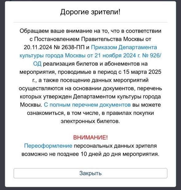 Категорически не хочется идти в театр одному, хотел купить два билета и спросить на Пикабу, кто хочет составить компанию. Но при выборе мест вылезло вот такое сообщение: Оказывается просто купить два билета нельзя, нужны документы из списка: Очевидно, что так компанию найти сложнее, но мало ли, если кто-то хочет завтра в 19: 00 сходить в театр Ермоловой, то напишите, обсудим. Кратко о себе: 30 лет, умеренной неказистости наружность, которая компенсируется ростом 194 см. Психологически не хочу один в театр, целей знакомиться или общаться нет, но против общения не буду, хотя сам социопат. Кстати, если есть пары студентов, которые хотели бы сходить в театр, но по каким-то причинам не получается, напишите, почему именно вам нужно дать билеты и куда. Одну-две пары выберу и оплачу билеты. Почему именно студентов? Потому что данные студака дать безопаснее, чем всё остальное, а возможность не всегда есть. Без рейтинга. Пост автора VoVlA. Читать комментарии на Пикабу.
