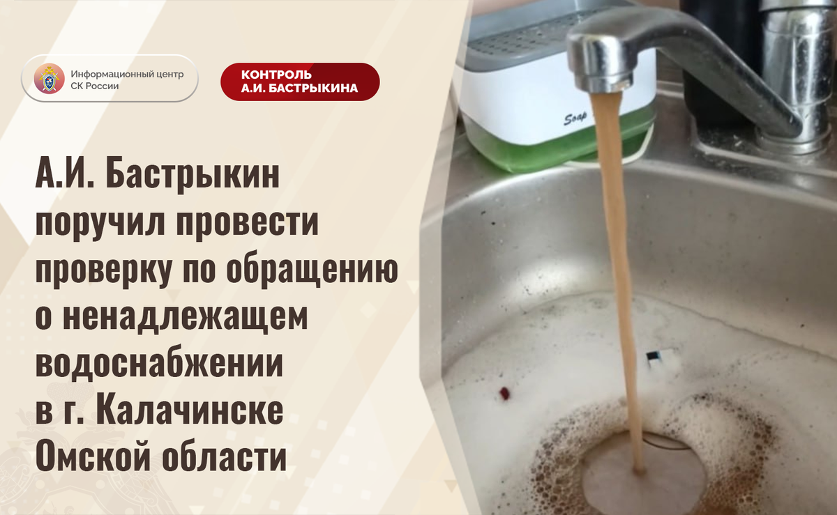А.И. Бастрыкин поручил провести проверку по обращению о ненадлежащем водоснабжении в г. Калачинске Омской области В Информационный центр СК России обратилась жительница Омской области. Она сообщила, что с марта текущего года в жилые здания, медицинские, социальные и образовательные учреждения подается жизненно необходимый ресурс, непригодный для питья и бытовых нужд ввиду наличия примесей, а также имеющий резкий неприятный запах. Несмотря на многочисленные обращения граждан в компетентные органы, меры к разрешению проблемы не принимаются. Местные жители опасаются, что использование воды, не отвечающей требованиям санитарных норм, может привести к распространению инфекционных заболеваний. Ранее указанная ситуация освещалась в социальных медиа. Председатель Следственного комитета Российской Федерации Александр Иванович Бастрыкин поручил руководителю СУ СК России по Омской области Виталию Владимировичу Батищеву провести процессуальную проверку и доложить об установленных в ходе первонача