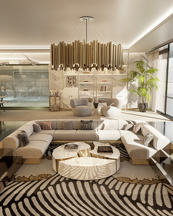 Современный дизайн интерьера постоянно развивается, но некоторые тенденции остаются неизменными, сочетая в себе роскошь, комфорт и функциональность. В этой статье мы проанализируем интерьер гостиной, который является ярким примером современного подхода к дизайну, сочетая в себе смелые элементы с утонченной элегантностью. Цветовая палитра и материалы: В этом интерьере преобладает нейтральная цветовая палитра, основанная на кремовых и бежевых тонах, которая создает ощущение простора и света. Однако, чтобы избежать монотонности, дизайнеры умело вводят контрастные элементы. Черный цвет пола и акценты в декоре, такие как ковер с анималистичным принтом, создают драматический эффект и добавляют глубины пространству. Материалы играют ключевую роль в создании ощущения роскоши. Мраморная отделка стен и кофейных столиков придает интерьеру изысканность и текстуру. Мягкая велюровая обивка дивана и кресел приглашает к отдыху и расслаблению, а металлические акценты, такие как золотые основания мебели