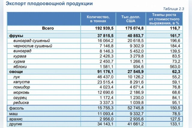 Несмотря на снижение физического объёма экспорта на 23,1% по сравнению с аналогичным периодом прошлого года, выручка от продаж увеличилась на 16,7%. В общем объёме экспорта страны доля фруктов и овощей составила 3,8%.