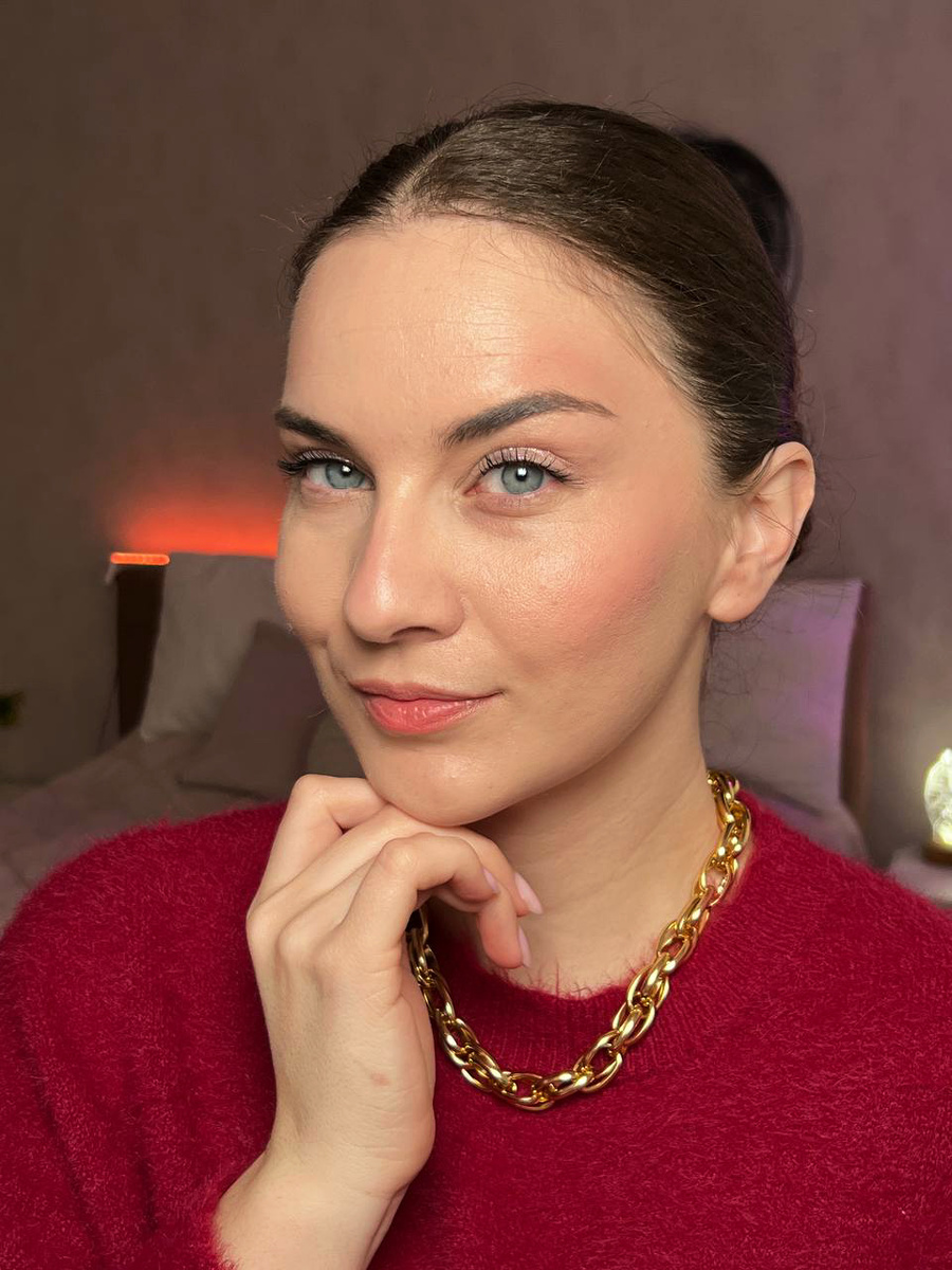 Чтобы придать своему образу свежести, советую нанести румяна ещё на переносицу и над бровью. Но наносить нужно совсем немного, проходясь остатками на кисти. Они придадут свежести вашему лицу, и вы получите новомодный эффект "разогретой кожи" (данный тренд в макияже 2025 задала Хайли Бибер).