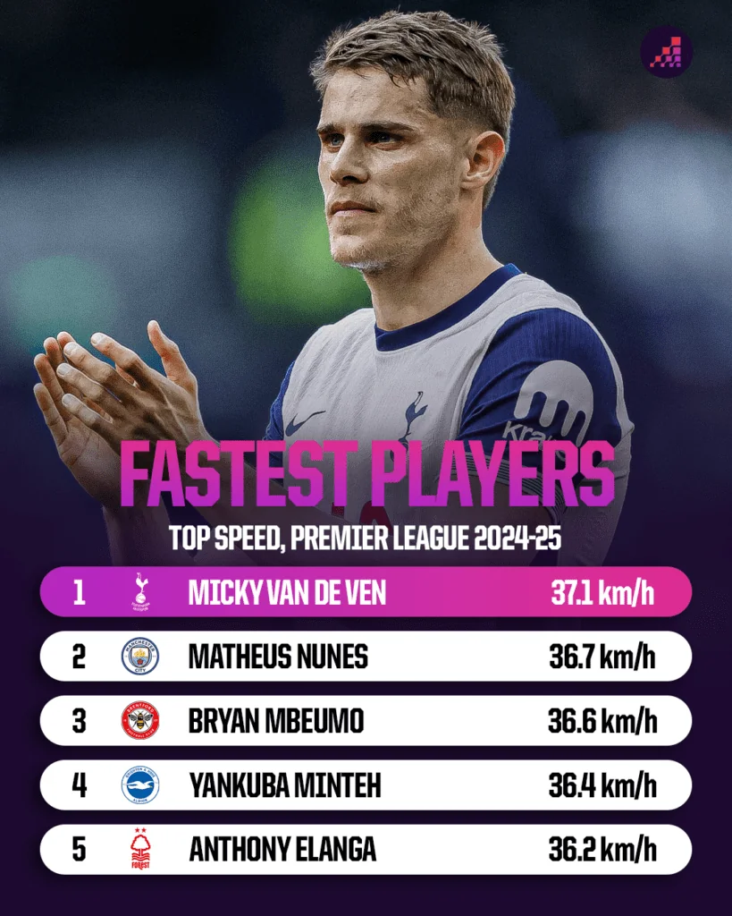Большая часть сезона позади и Opta Analyst выкатила данные по самым быстрым и самым медленным футболистам АПЛ сезона-2024/25. Второй год подряд лидерство удерживает центральный защитник «Тоттенхэма» Микки ван де Вен − 37,1 км/ч. Неизвестно, чем его кормят, но обогнать его решительно невозможно. Где-то рядом находятся Матеуш Нунеш из «Вулверхэмптона» (36,7 км/ч) и Бриан Мбемо из «Брентфорда» (36,6 км/ч). Далее идут Янкуба Минте из «Брайтона» (36,4 км/ч) и Энтони Эланга из «Ноттингем Форест» (36,2 км/ч). На этот раз Opta также дала данные по самым медленным спринтам в сезоне − в рейтинге не участвовали вратари. И здесь на первом месте довольно неожиданный игрок − вингер «Манчестер Сити» Бернарду Силва (29,4 км/ч). Похоже, что португалец стареет или просто экономит силы. Далее идут Крэйг Доусон из «Вулверхэмптона» (29,6 км/ч), Микель Мерино из «Арсенала» (29,8 км/ч), Каземиро из «Манчестер Юнайтед» (30,2 км/ч) и Томаш Соучек из «Вест Хэма» (30,2 км/ч). Кто самый быстрый игрок АПЛ? В топе