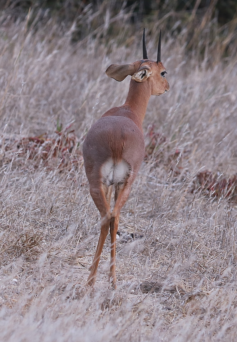 Мы заметили эту антилопу неподвижно стоящей. Даже засомневались, всё ли с ней хорошо: мы объехали её несколько раз - стоит... Решили оставить в покое : вмешиваться в жизнь диких животных нельзя. Съездили по своим делам - возвращаемся, стоит! Но в конце концов наше внимание ей надоело, и она, к великому нашему облегчению, умчалась:)