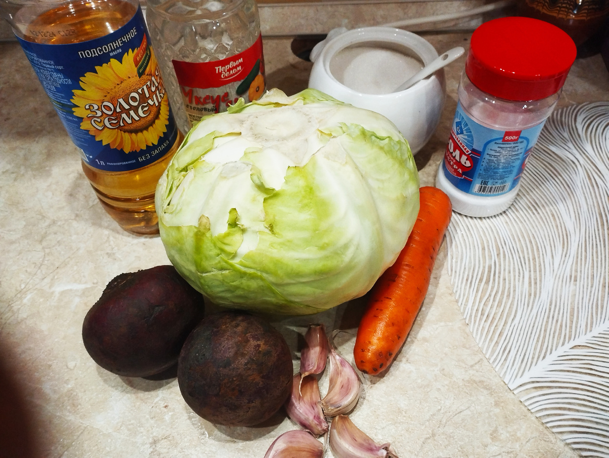 Здравствуйте! Сегодня я хочу поделиться с вами рецептом вкусной и полезной закуски. Этот рецепт я узнала из маминой коллекции и он мне очень понравился. Попробуйте обязательно — он понравится всем, даже тем, кто не очень любит капусту. К тому же это постная закуска, что сейчас особенно актуально. Ну что, приступим к приготовлению? Капусту почистить от верхних листьев и нашинковать Свеклу и морковь натереть на крупной терке Чеснок натереть на мелкой терке или воспользоваться прессом. Все складываем в кастрюлю И перемешиваем руками с усилием что бы капуста дала сок, так она будет мягкой и хрустящей Готовим маринад: Кастрюлю поставить газ залить в нее 1 литр воды добавить сахар соль уксус и масло Довести до кипения и кипятить 3 минуты, потом дать постоять 5 минут и вылить маринад в капусту И ставим все под пресс на 12 часов Как кастрюля остынет нужно вместе с прессом убрать в холодильник . Через 12 часов достаем и перемешиваем руками также с усилием нажимаем на овощную массу потом ст