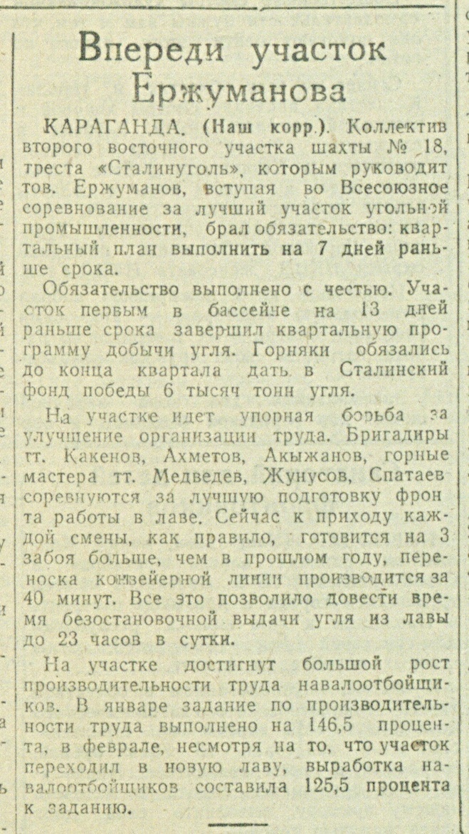 В этот день, 23 марта 1945 года, газета «Казахстанская правда» публикует заметку о коллективе шахтеров, которые завершили квартальный план на 13 дней раньше срока, сдав в Сталинский фонд победы 6000 тонн угля. ВПЕРЕДИ УЧАСТОК ЕРЖУМАНОВА Караганда. (Наш корр.). Коллектив второго восточного участка шахты № 18, треста «Сталинуголь», которым руководит, тов. Ержуманов, вступая во Всесоюзное соревнование за лучший участок угольной промышленности, брал обязательство: квартальный план выполнить на 7 дней раньше срока. Обязательство выполнено с честью. Участок первым в бассейне на 13 дней раньше срока завершил квартальную программу добычи угля. Горняки обязались до конца квартала дать в Сталинский фонд победы 6 тысяч тонн угля. На участке идёт упорная борьба за улучшение организации труда. Бригадиры тт. Какенов, Ахметов, Акыжанов, горные мастера тт. Медведев, Жунусов, Спатаев соревнуются за лучшую подготовку фронта работы в лаве. Сейчас к приходу каждой смены, как правило, готовится на 3 забоя