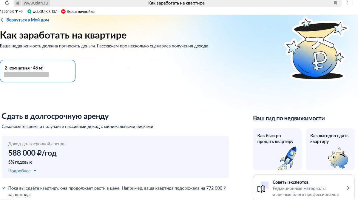 Вы имеете квартиру и никак не можете на ней заработать? Бедный несчастный собственник! Вам нужна помощь и помощь есть! Идите на Циан где открылся новый сервис "Как заработать на квартире". Казалось бы, у вас есть собственность, и что вам нужно делать, что бы денежки потекли к вам в карман? Мы были удивлены, но видимо на Циане считают, что наши граждане блуждают в трех соснах. Надо открыть им Америку и подсказать таки куда идти! Итак очевидно, что способов заработать на недвижимости хватит посчитать пальцев одной руки. Ну что еще можно придумать кроме продажи и аренды? Ан, нет! Специально зашли на сайт и что мы там видим? Вам предлагают забить данные квартиры, которая названа "Мой дом". Ну, что же, пробуем! Вводим данные собственной квартиры, единственно, что удобно, Циан сразу подгружает данные о площади и выдает ориентировочную цену. Ну ладно! После этого появляется возможность активировать кнопку "Как заработать на квартире". Ну и? Нам предлагают сдать квартиру в долгосрочную аренду,