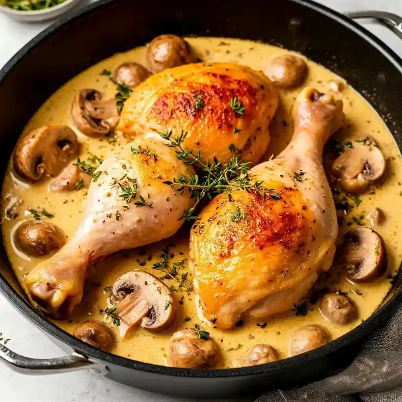 Куриные ножки, приготовленные на сковороде в сливочном соусе с грибами, – это вкусное, сытное и ароматное блюдо, которое идеально подойдет для семейного ужина! Готовится оно довольно просто и быстро. Начнем с подготовки ингредиентов. Куриные голени (550 г) промойте и обсушите бумажным полотенцем. Посолите и поперчите куриные ножки по вкусу. Лук репчатый (70 г) очистите и мелко нарежьте. Шампиньоны (130 г) промойте и нарежьте пластинками. В сковороде разогрейте растительное масло на среднем огне. Выложите куриные ножки в сковороду и обжаривайте с обеих сторон до золотистой корочки, примерно по 5-7 минут с каждой стороны. Уберите обжаренные куриные ножки из сковороды и отложите в сторону. В ту же сковороду добавьте немного растительного масла и выложите нарезанный лук. Обжаривайте лук до мягкости и золотистого цвета, примерно 3-5 минут. Добавьте нарезанные шампиньоны к луку и обжаривайте еще 5-7 минут, пока грибы не станут мягкими и не выпустят жидкость. Влейте сливки (200 г) в сковороду