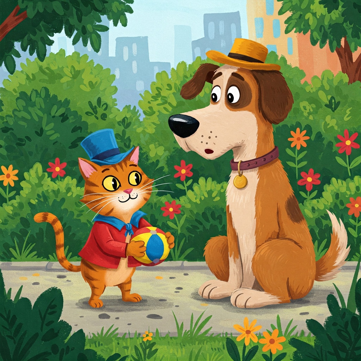 В одном маленьком городке жил-был храбрый кот по имени Барсик. Он был известен всем своей любовью к приключениям и шалостям. Каждый день он придумывал что-то новое, чтобы развеселить своих друзей и, конечно же, немного подразнить их. Однажды Барсик решил подшутить над своим лучшим другом, псом по имени Бобик. Бобик был большим и сильным, но очень добрым псом, который любил играть в мяч больше всего на свете. Барсик знал, что Бобик хранит свой любимый мяч в саду за домом. — Бобик, — сказал Барсик, подкравшись к другу, — я слышал, что твой мяч волшебный! Можно мне поиграть с ним? Бобик, который был очень щедрым, согласился: — Конечно, Барсик! Но только не теряй его, ведь это мой любимый мяч. Барсик, конечно же, не собирался терять мяч. Он просто хотел немного подшутить над Бобиком. Он взял мяч и быстро спрятал его за кустом. — Ой, Бобик, — сказал он, притворяясь удивлённым, — кажется, твой мяч исчез! Бобик забеспокоился и начал искать мяч. Барсик тем временем смеялся, наблюдая за его пои