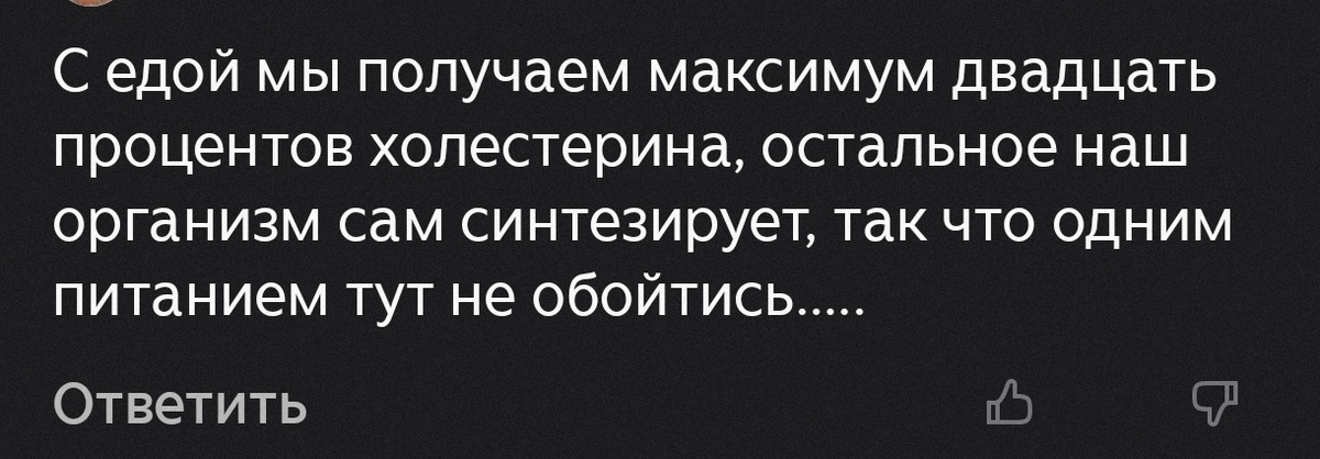 Очень часто, когда я пишу статьи на тему питания при гиперхолестеринемии и дислипидемии, то получаю такие вот комментарии, что холестерин одним питанием не снизить, поскольку с питанием мы получаем лишь 20% холестерина, а 80% печень синтезирует сама.