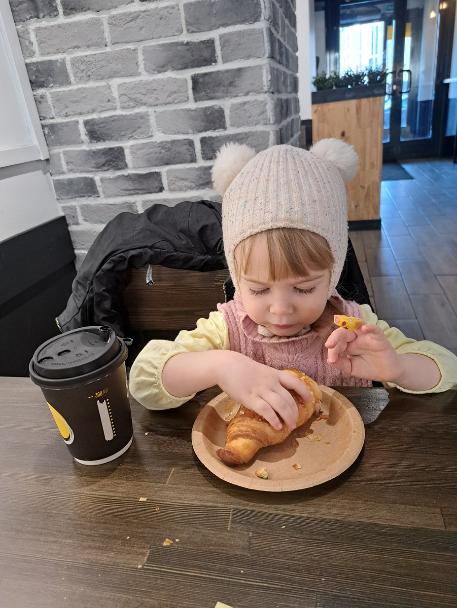 Я Лере пообещала,что за ее мучения мы пойдем завтракать в пекарню рядом с гемотестом. Взяла ей круассан и какао, которое она не стала.