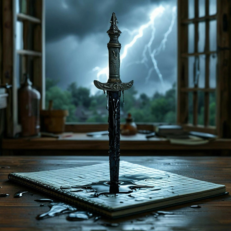 - Опасность соберу в ладонь, скину опасность в огонь. Гори, опасная сила, обернись крахом и меня не тронь. Да будет так! – С этими словами Беньяминов выхватил из-под промокшей полы пиджака потемневший от времени кинжал с удлинённым клинком в виде тонкого языка пламени, сделал шаг вперед, и с размаху пригвоздил визжащую и вопящую тетрадь к столешнице.