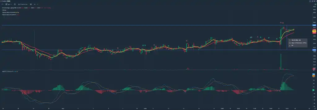 На скрине июньский фьючерс X5M5, где основной рост возник 21 марта 2025 года. Последние две недели с 10 по 21 марта канал торговли фьючерсом становился всё уже и уже. Хотелось за неделю до отчета МСФО Х5 и заседания ЦБ по ставке еще разок прокатиться в канале от 3475 до 3670. А в последние дни перед отчетом войти в ключевую сделку от 3570. Но канал становился настолько узким, что надежда поучаствовать в ралли с двойным объемом по максимально низким закупочным ценам, таяла. 20 марта выставил ордера на покупку, часть которых сработали 21 марта с открытия основной сессии: - 3475 - не сработала, не хватило двух пунктов. - 3500 - докупил - 3550 - докупил - 3590 - докупил Большую часть распродал спустя 2 часа. Остаток оставил для наблюдений. Скорее всего, позже переключусь на сентябрьский фьючерс. И вот почему он должен продолжать рост, но не обязан )). Личная промежуточная дивидендная доходность составит 23,75%. Покупал по 2728 руб. Итоговая годовая может составить около 41%. Звучит нереаль