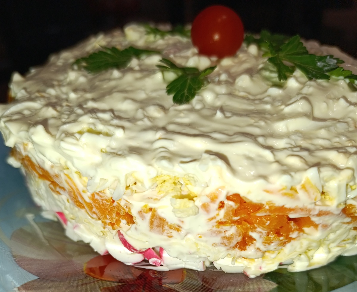 Невероятно вкусный и нежный салат из крабовых палочек. Ингредиенты: крабовые палочки - 200 гр морковь - 2 небольшие шт яйца - 4 шт сыр - 100 гр майонез Яйца и морковь отвариваем. Крабовые палочки нарезаем. Салат слоеный, поэтому его можно собирать или в глубокой посуде или в кулинарном кольце. Дно смазываем немного майонезом. Выкладываем крабовые палочки и также смазываем майонезом. Натираем сыр на некрупной терке, выкладываем сверху палочек и смазываем майонезом. Натираем морковь на крупной терке, выкладываем сверху сыра и смазываем майонезом. Натираем яйца на некрупной терке, выкладываем сверху моркови, смазываем майонезом. Снимаем кольцо, украшаем, приятного аппетита!