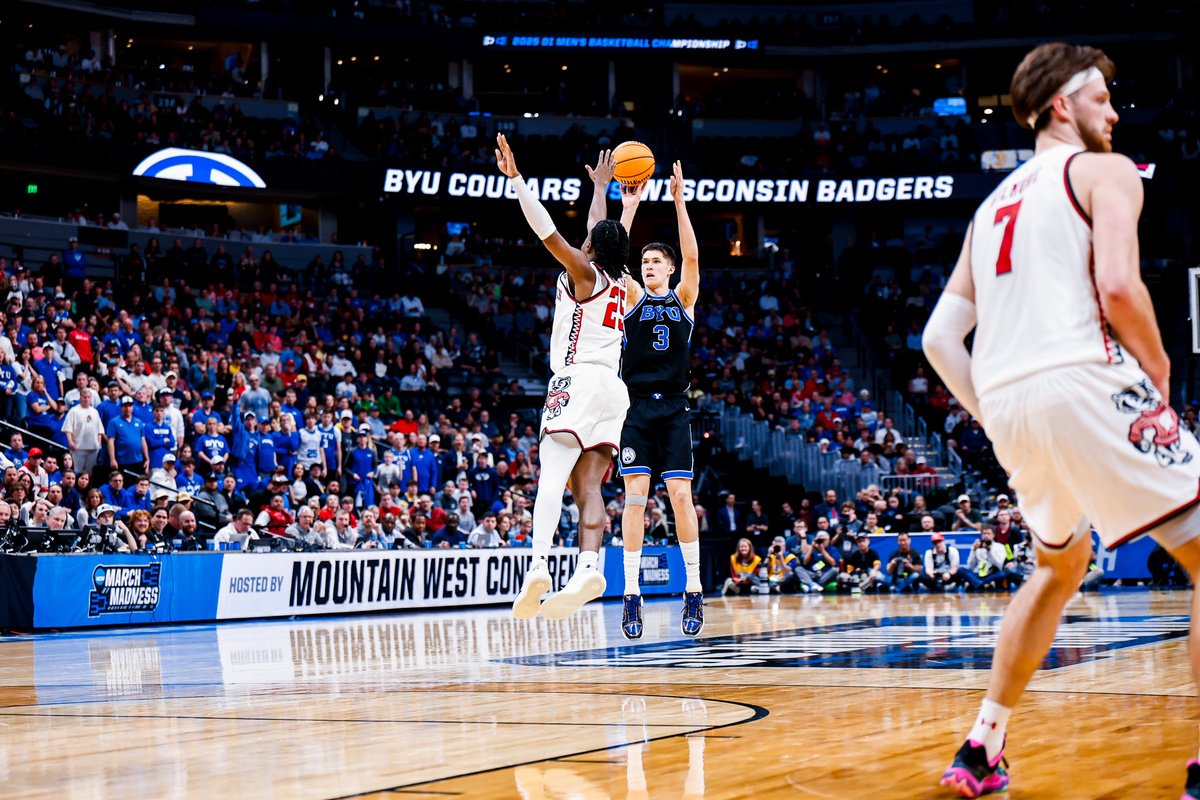 Вслед за Владом Голдиным и его Michigan на паркет Ball Arena в Денвере вышли BYU Cougars и Wisconsin Badgers. Про BYU вы и сами все знаете, это команда, за которую выступает российский защитник Егор Демин; Wisconsin — недавний соперник Голдина по финалу конференции Big 10. В регионе Badgers были «посеяны» третьими, в то время как Демин и Ко — шестыми. Но, к счастью, в этот вечер случился «апсет». BYU сходу завладели преимуществом и вплоть до самой концовки держали Wisconsin на расстоянии в несколько атак. Правда, чуть не растеряли «+11» за две с половиной минуты до конца… Но Тонджи в проходе промазал и пропустил «пум» в стадию Sweet 16 — 91:89. Егор Демин в этот вечер пофлиртовал с трипл-даблом, за 26 минут отметившись статистикой в 11 очков (3/10 с игры, 3/3 с линии), 8 подборов, 8 передач, 1 перехват и 1 потерю. Дальше по сетке BYU попадает на победителя в паре Saint Mary's и Alabama, матч между этими соперниками пройдет сегодня ночью. Подписывайтесь на телеграм-канал «Перехват» — ва