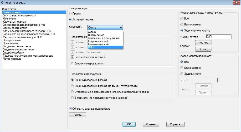 Создадим спецификация для функциональной схемы автоматизации. Запускаем команду: вкладка «Отчеты» > панель «Схема» > «Отчеты». В диалоге «Отчеты по схемам» выбираем: · Имя отчета – Спецификация · В разделе «Спецификация» - Активный чертеж · Категория – из списка выбираем «КИП» (в отчет включаются компоненты, у которых атрибут «WDTYPE» имеет значение «PI») · Параметры отображения – Обычный сводный формат · В разделе «Извлекаемые коды функц. группы», выбираем «Задать функц. группу», нажимаем кнопку «Чертеж» и из списка функциональных групп чертежа выбираем значение «КИП» · В разделе «Использовать коды мест» - Все. Нажимаем кнопку ОК. В диалоге «Формирование отчетов» выводится спецификация функциональной схемы. Нажимаем кнопку «Поместить на чертеж». В диалоге «Настройка формирования таблицы» вводим необходимые настройки и нажимаем кнопку ОК. Размещаем спецификацию на чертеже.