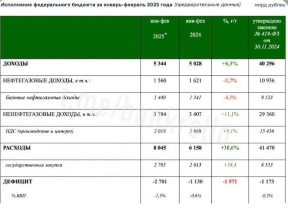 По итогам февраля ситуация с дефицитом федерального бюджета значительно ухудшилась. За первые 2 месяца он составил 2,7 трлн рублей при годовом плане 1,173 трлн. Таким образом, за январь и февраль годовой план по дефициту бюджета превышен в 2,3 раза. Все предыдущие годы в январе и феврале проплачивались большие предоплаты по гособоронзаказу, что заметно повышало расходы первых месяцев и создавало повышенный дефицит. Но все познается в сравнении: столь высоких расходов, как в этом году, не было еще никогда. Если до этого дефицит по итогам первых двух месяцев оказывался примерно на уровне годового, то сейчас он в 2,3 раза превысил годовой уровень. Из таблицы Минфина видно, что за 2 первых месяца текущего года расходы составили 8,045 трлн рублей, тогда как в прошлом году за аналогичный период они были на 2 трлн меньше - 6,158 трлн. Таким образом, дефицит бюджета сейчас составляет 2,701 трлн рублей, тогда как в прошлом году он был 1,130 трлн - в 2,4 раза меньше. А годовой план по расходам у