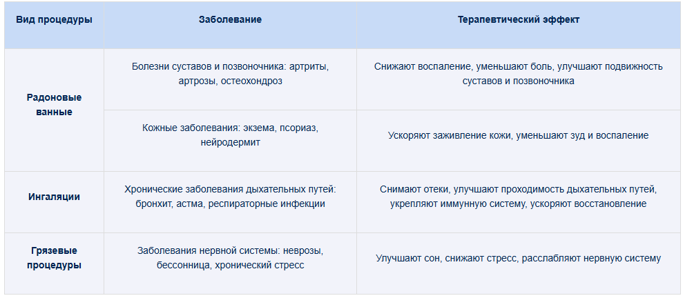 - Заболевания суставов и позвоночника: у 70-80% пациентов с остеоартритами, остеохондрозом и хроническими болями в суставах отмечено существенное облегчение симптомов после курса радоновых процедур.